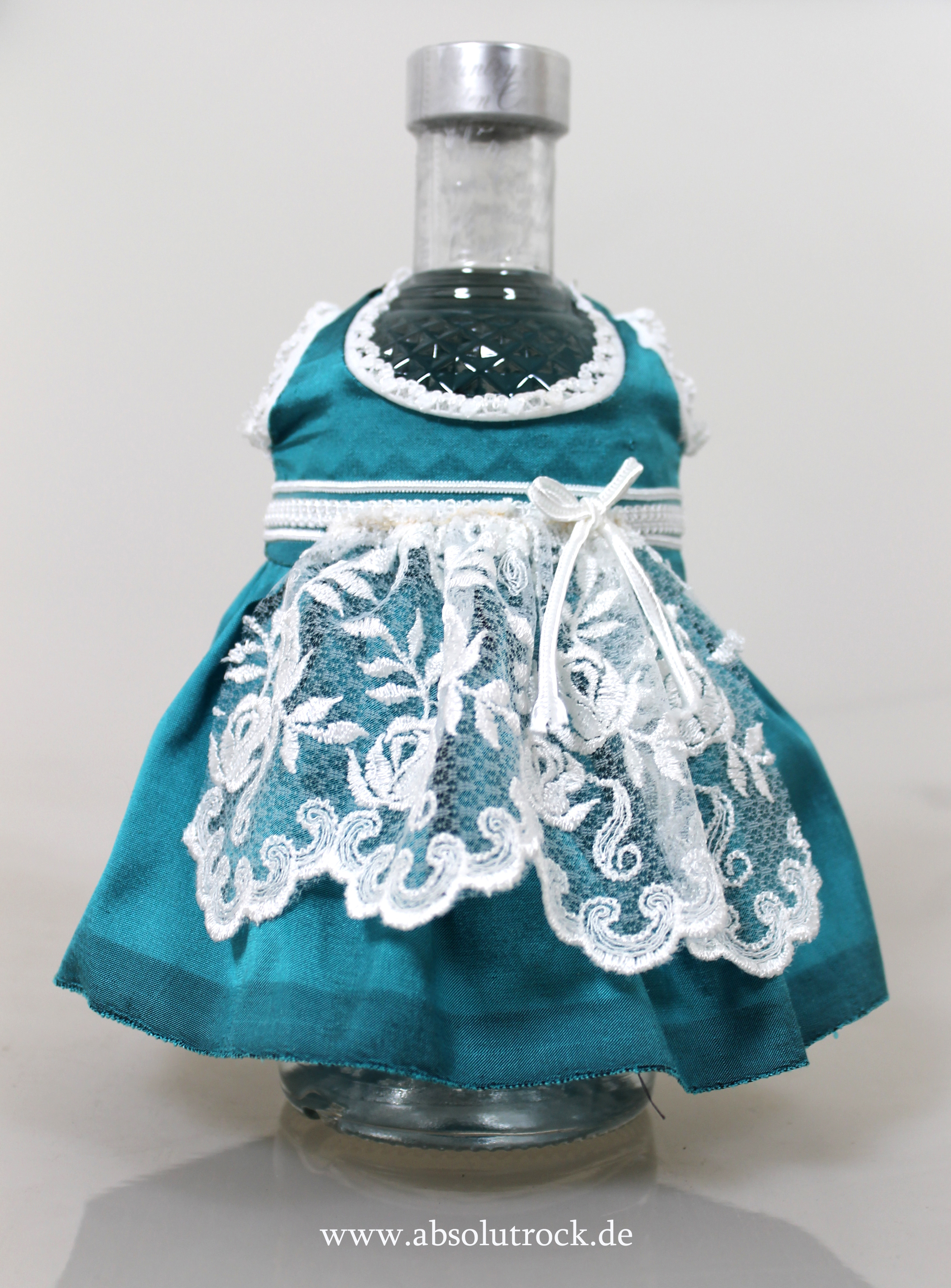 Die Absolut Glimmer 0,7 Liter Flasche ist in ein türkises Dirndl gepackt. Hierzu kommt noch eine Schürze aus weisser Spitze.